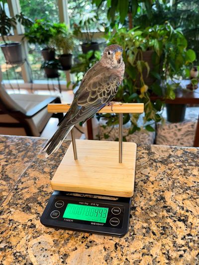 Regularly tracking your bird’s weight can be extremely beneficial. All the species we work with are prey animals in the wild, which means they instinctively hide signs of illness to avoid appearing vulnerable to predators. As a result, sudden weight loss is often one of the very first and only visible signs of a health issue. To monitor your bird’s weight, you can use a bird scale with a perch, or train your bird to comfortably sit on a standard kitchen scale. Weighing your bird regularly (preferably at the same time each day) can help you catch any health concerns early.